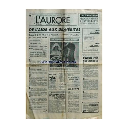 AURORE (L') [No 9268] du 20/06/1974 - de l'aide aux desherites - giscard a la tele les bizarres bibis d'ascot du nouveau contre les cambrioleurs et les vandales les secrets de la reforme ponia mi-tempspar pado le differend franco-americain aplani - l'europe peut redemarrer par faure la coupe, les resultats les vins de bordeaux