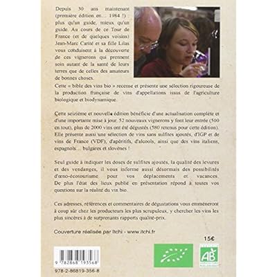Depuis 30 ans maintenant (première édition en... 1984 !) : plus qu'un guide, mieux qu'un guide. Au cours de ce Tour de France (et de quelques voisins) Jean-Marc Carité et sa fille Lilas vous conduisent à la découverte de ces vignerons qui prennent soin autant de la santé de leurs terres que de celles des amateurs de bonnes choses. Cette «bible des vins bio» recense et présente une sélection rigoureuse de la production française de vins d'appellations issus de l'agriculture biologique et biodynamique. Cette seizième et nouvella édition bénéficie d'une actualisation complète et d'une importante mise à jour. 52 nouveaux vignerons y font leur entrée (500 en tout), plus de 2000 vins ont été dégustés (580 retenus pour cette édition). Elle présente aussi une sélection de vins sans sulfites ajoutés, d'IGP et de vins de France (VDF), d'apéritifs, d'alcools, ainsi que des vins italiens, espagnols... bulgares et Slovènes ! Seul guide à indiquer les doses de sulfites ajoutés, la qualité des levures et des vendanges, il vous informe aussi désormais des possibilités d'oeno-écotourisme pour vos déplacements et vacances. De plus l'état des lieux publié en présentation répond à toutes vos questions sur la réalité du vin bio. Ces adresses, références et commentaires de dégustations vous emmèneront à coup sûr chez les producteurs les plus scrupuleux, y chercher les vins les plus sincères à de surprenants rapports qualité-prix.