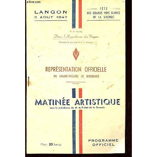 R320037728. PROGRAMME OFFICIEL (PLAQUETTE) - REPRESENTATION OFFICIELLE DU GRAND THEATRE DE BORDEAUX - FETE DES GRANDS VINS BLANCS DE LA GIRONDE - MATINEE ARTISTIQUE SOU LA PRESIDENCE DE M. LE PREFET DE LA GIRONDE - A LANGON LE 3 AOUT 1947.. 1947. In-12. Broché. Etat d'usage, Couv. défraîchie, Agraffes rouillées, Intérieur acceptable. PLAQUETTE DE 8 pages augmentées de quelques petites photos-portraits monochromes in texte.. . . . Classification Dewey : 790-Loisirs et arts du spectacle